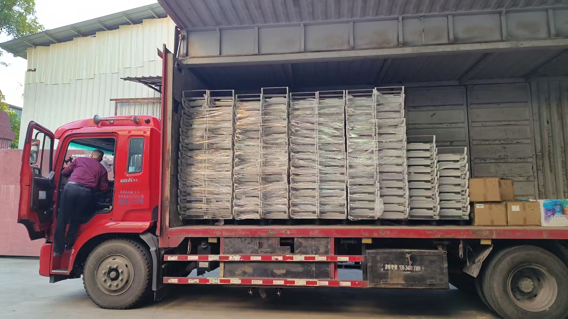 工厂也还快马加鞭, 顶着炎热的天气装车发货, 及时把货物送到学校, 工人也有序进行安装。